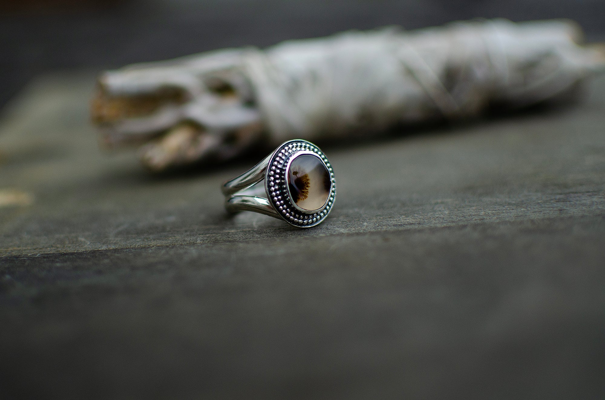 Beautiful handmade sterling silver ring that features a gorgeous Dendritic Agate. Light weight and comfortable with a split shank band.
